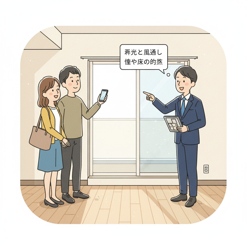 採光と風通し: 窓から光が十分に入るか、風通しは良いかを確認します。できれば午前と午後の両方で日当たりを確認できるとベストですが、難しい場合は方角で判断しましょう。