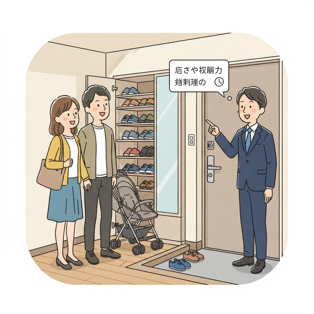 広さや収納力: 靴箱の大きさや、ベビーカーなどを置くスペースがあるかを確認しましょう。